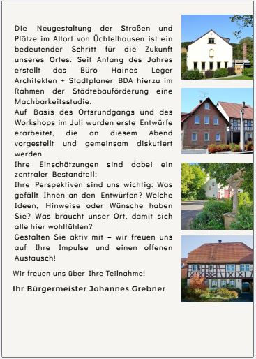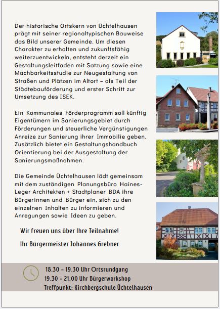 Einladung zum 2. Bürgerworkshop zur "Machbarkeitsstudie zur Neugestaltung von Straßen und Plätzen im Altort Üchtelhausen"