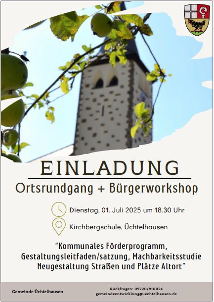 Die Gemeinde Üchtelhausen lädt alle Bürgerinnen und Bürger herzlich zum zweiten Bürgerworkshop zur Erstellung einer Machbarkeitsstudie zur Neugestaltung der Straßen und Plätze im Altort Üchtelhausen ein. Seit Anfang des Jahres erarbeitet das Büro Haines Leger Architekten + Stadtplaner BDA eine Machbarkeitsstudie hierzu im Rahmen der Städtebauförderung. Auf Grundlage des Ortsrundgangs und des Workshops im Juli liegen nun erste Entwürfe vor. Diese werden im Workshop vorgestellt und gemeinsam mit Ihnen diskutiert.
