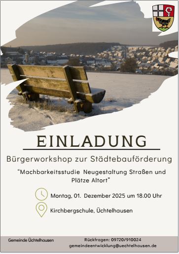 Die Gemeinde Üchtelhausen lädt alle Bürgerinnen und Bürger herzlich zum zweiten Bürgerworkshop zur Erstellung einer Machbarkeitsstudie zur Neugestaltung der Straßen und Plätze im Altort Üchtelhausen ein.